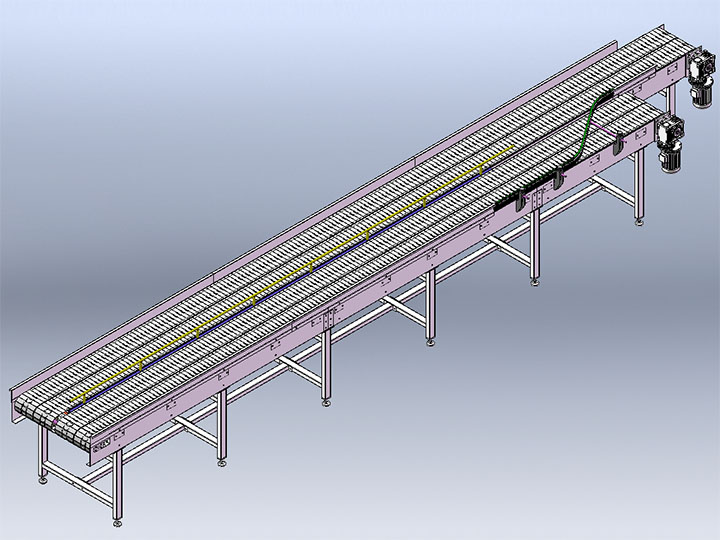鏈板輸送機是一種以標(biāo)準(zhǔn)鏈板為承載面,由馬達減速機為動力傳動的傳送裝置。鏈板式輸送機,由動力裝置(電機)、傳動軸、滾筒、張緊裝置、鏈輪、鏈條、軸承、潤滑劑、鏈板等等構(gòu)成。其中帶動物料的輸送的主要的兩個部分為:鏈條,利用它的循環(huán)往復(fù)運動提供牽引動力;金屬板,作為輸送過程中的承載體。可以通過多列鏈板并行,使鏈板輸送機做的很寬并形成差速,利用多列鏈板的速度差使多列輸送在無擠壓的情況下變?yōu)閱瘟休斔?,從而滿足飲料貼標(biāo)、灌裝、清洗等設(shè)備的單列輸送的要求,我們可以將兩條鏈板輸送機的頭尾部做成重疊式的混合鏈?zhǔn)沟闷浚ü蓿w處于動態(tài)過度狀態(tài),使輸送線上不滯留物料,可以滿足空瓶以及實瓶壓力和無壓力輸送。